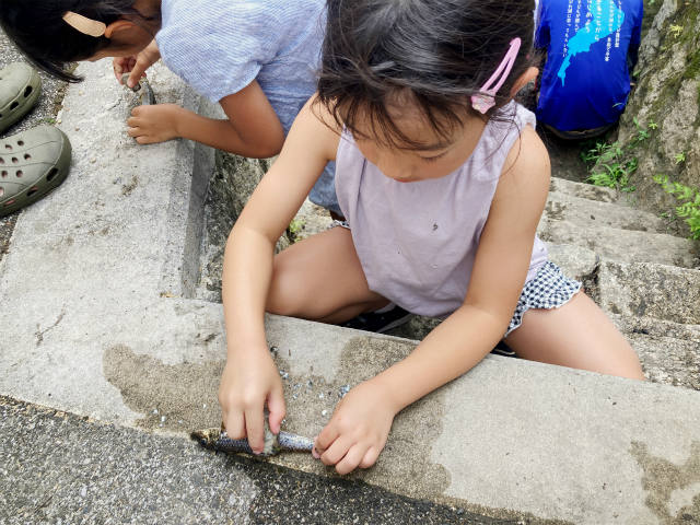 川から上がってきて、みんなで捕まえたお魚を観察しています。