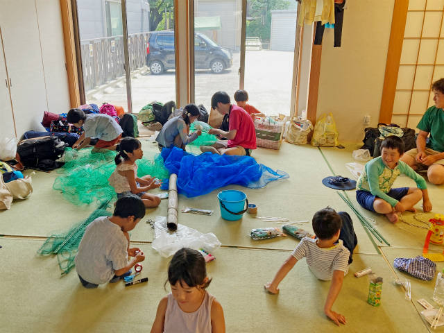 お昼ご飯を食べ終わったら、 お魚を獲るための“しかけ作り”をします!