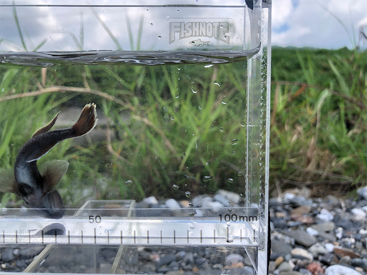 真っ黒な魚体にいくつもの差し色をまとったトウヨシノボリ。